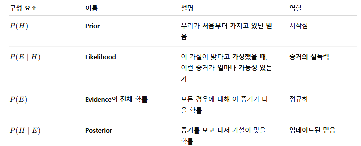 구어체로 바꾼다면 "원래 그렇게 생각하고 있었는데(Prior), 지금 이런 일이 일어났으니까(Evidence), 그 생각이 맞을 확률을 다시 계산해보자" (Posterior) " 계산할 때는,"그 생각이 맞다고 했을 때 이런 일이 일어날 가능성(Likelihood)"을 곱해서 조정하는 방식이야.